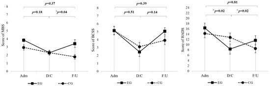 A linear mixed model (LMM) was used to compare the changes over time in each variable (MBS, BCSS, and HADS) between groups. The intervention effect across admission, discharge, and 6 months after discharge was analyzed using LMM. Statistical significance was set at p < 0.05. All analyses were conducted using SAS 9.4 statistical software (SAS Institute Inc., Cary, NC, USA).