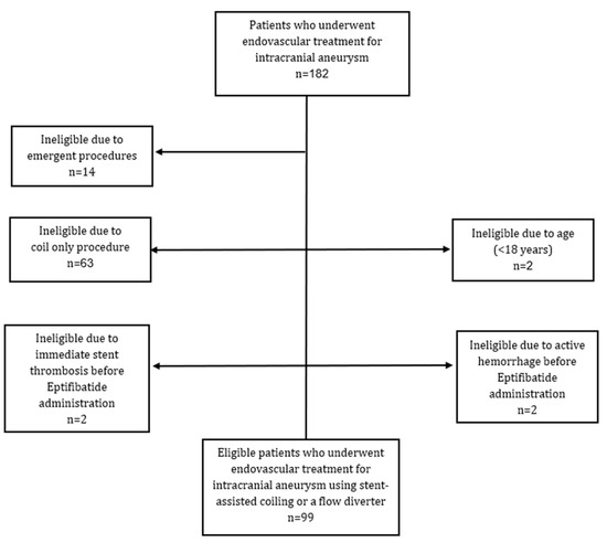 - Sedat, J.; Chau, Y.; Mondot, L.; Chemla, R.; Lonjon, M.; Padovani, B. Is eptifibatide a safe and effective rescue therapy in thromboembolic events complicating cerebral aneurysm coil embolization? Single-center experience in 42 cases and review of the literature. Neuroradiology 2014, 56, 145–153. [Google Scholar] [CrossRef] [PubMed]