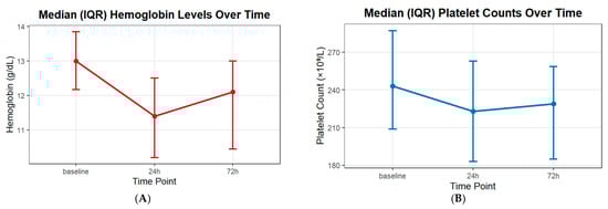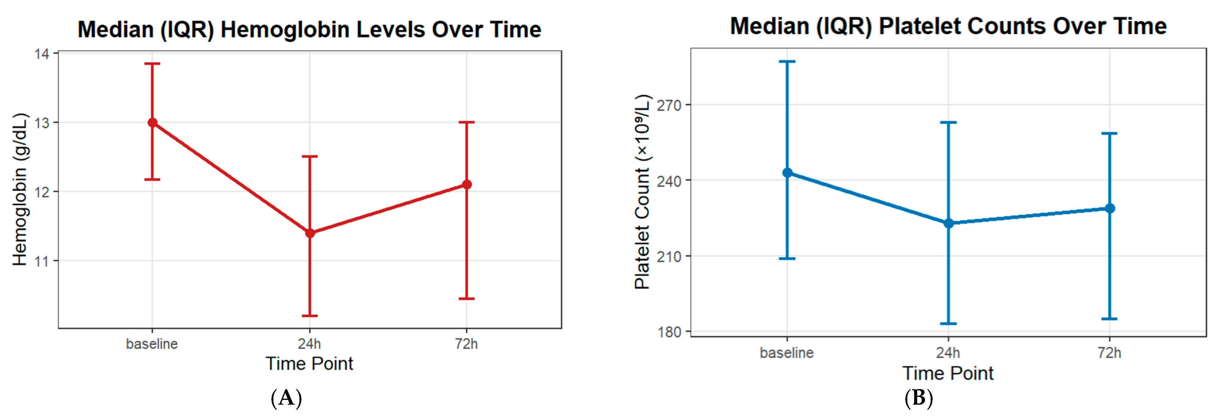 The repeated-measures ANOVA demonstrated a significant effect of time on hemoglobin levels (F1.58,115.38 = 76.21, p < 0.001, partial η2 = 0.51), with a decrease at 24 h and a following increase by 72 h, as presented in Figure 2A. The time by stent type interaction (p = 0.20) and overall group effect (p = 0.12) were not significant, indicating comparable temporal patterns between the SAC and FD groups. The repeated-measures ANOVA demonstrated a significant effect of time on platelet counts (F2,146 = 14.29, p < 0.001, partial η2 = 0.16), indicating a postoperative decrease with an increase by 72 h, as presented in Figure 2B. The time by stent type interaction (p = 0.63) and overall group effect (p = 0.65) were not significant, showing comparable temporal patterns in platelet counts between the SAC and FD groups.