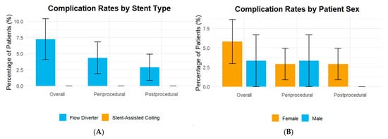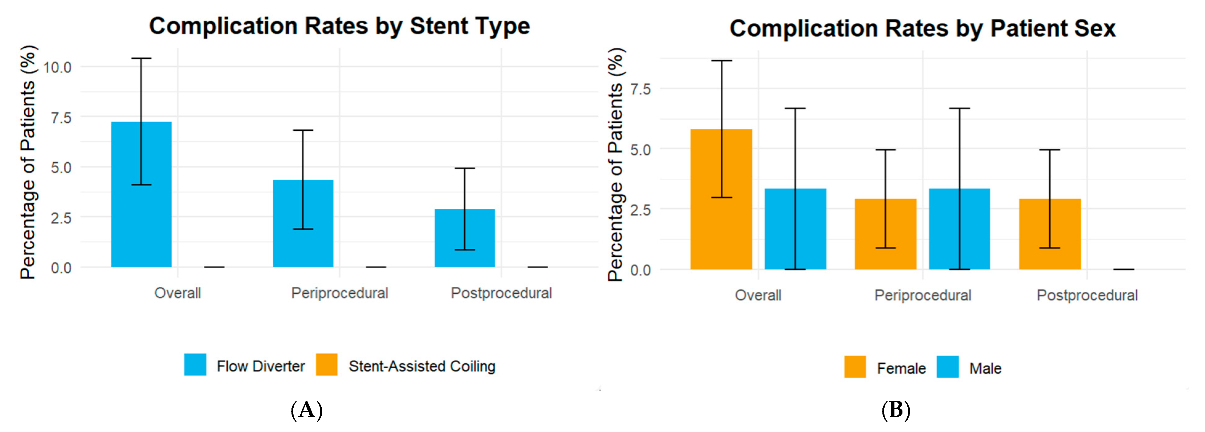 Figure 3 presents complication rates stratified by patient sex (Figure 3A) and stent type (Figure 3B). There were no statistically significant differences in peri-procedural, post-procedural, or overall complication rates between males and females. Although complication rates were numerically higher in the flow diverter group compared with stent-assisted coiling, these differences did not reach statistical significance.