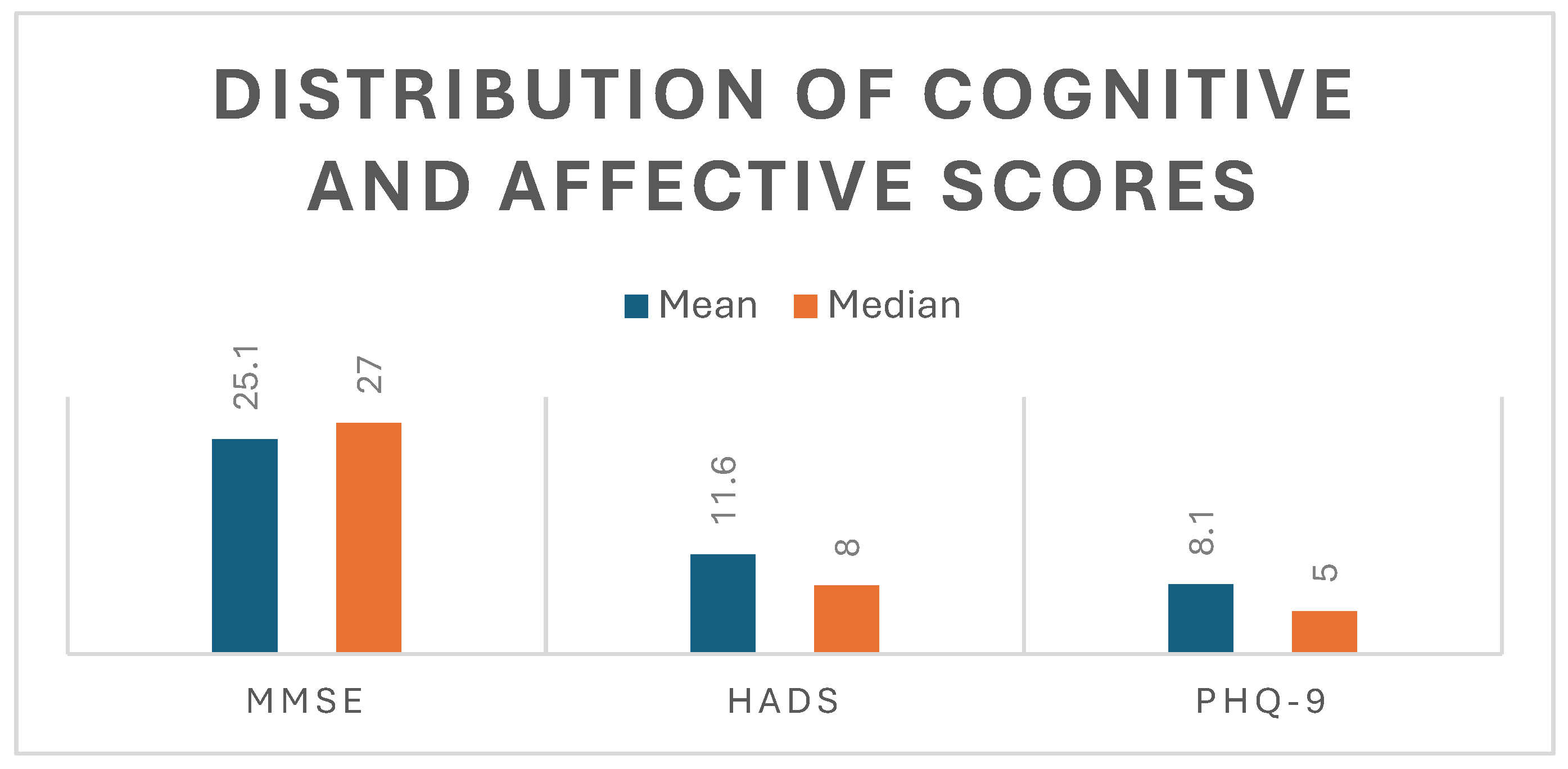 Distribution of cognitive and affective scores. Mean and median values of cognitive (MMSE) and affective (HADS, PHQ-9) scores, illustrating higher central tendency in cognitive performance and greater variability in affective measures.