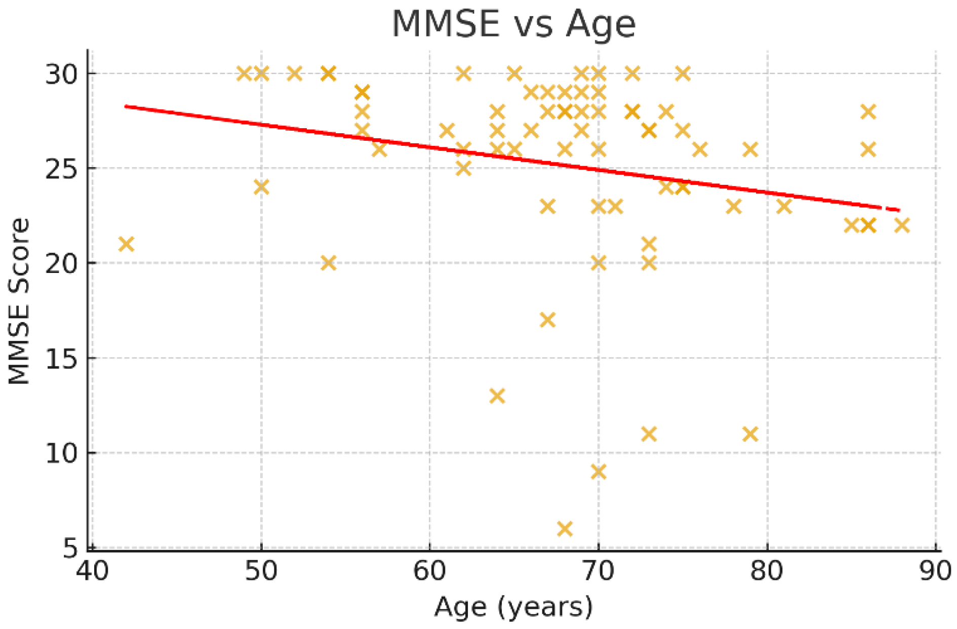 Scatter plot of MMSE scores compared to age. This scatter plot illustrates the relationship between age and cognitive function as measured by the Mini-Mental State Examination (MMSE). Each point represents an individual patient (n = 71). A downward trendline indicates a negative association between age and MMSE scores, suggesting that older patients tend to have lower cognitive performance in the post-stroke recovery phase. Although the correlation did not reach statistical significance (Spearman’s ρ < 0, p ≈ 0.07), the observed trend is consistent with the expected age-related decline in cognitive reserve.