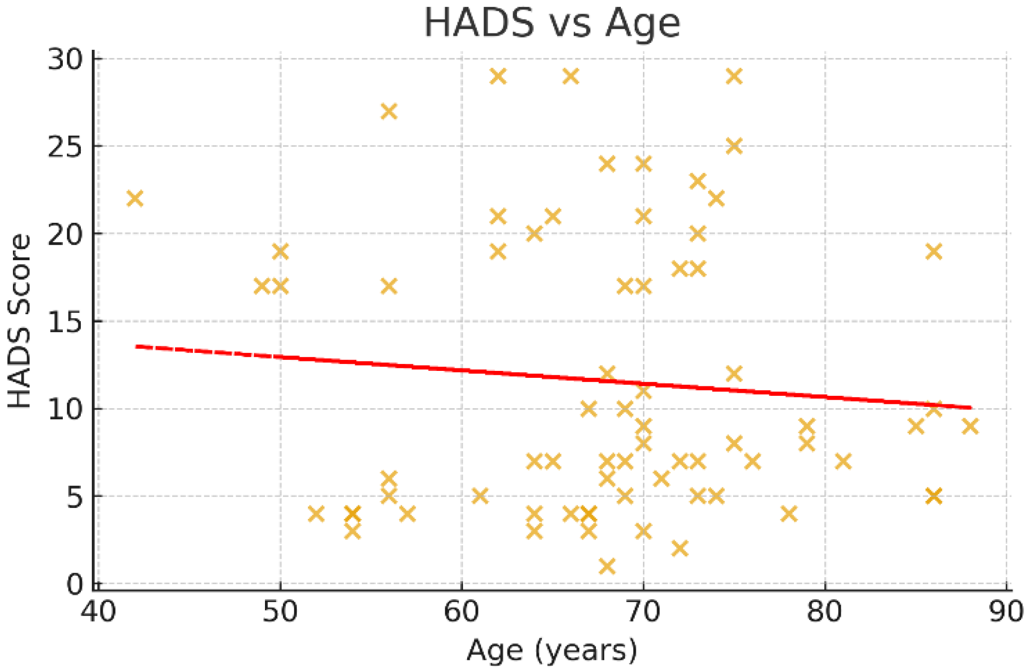 Scatter plot of HADS scores and age. This scatter plot depicts the distribution of Hospital Anxiety and Depression Scale (HADS) total scores across different ages. The red trendline demonstrates a flat trajectory, indicating no meaningful correlation between age and anxiety/depression symptom burden in this sample (Spearman’s ρ ≈ 0, p > 0.05). These findings suggest that emotional distress following stroke was independent of patient age, reflecting the heterogeneous nature of affective responses in stroke survivors.