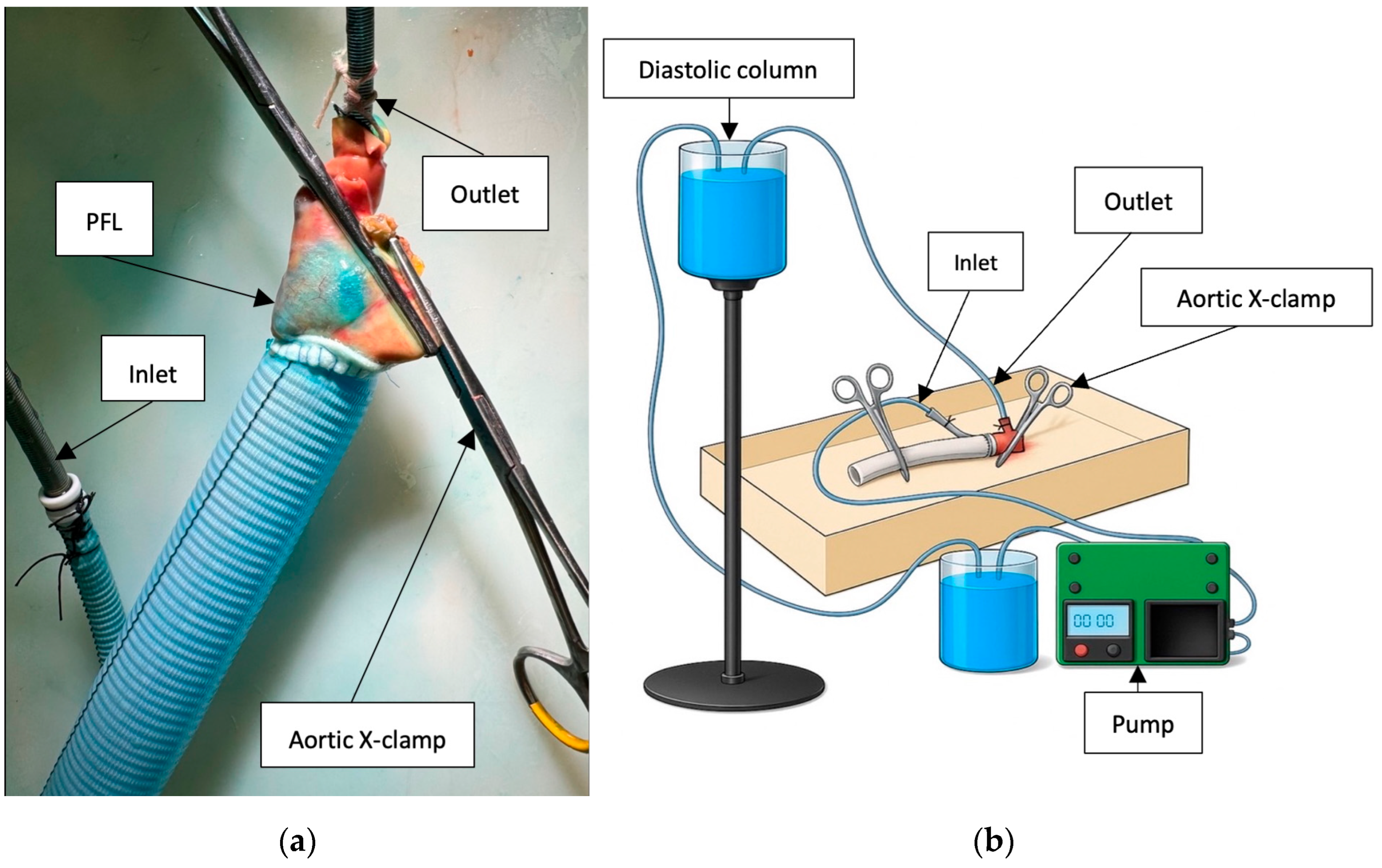 Following surgical repair, each specimen underwent both static and dynamic perfusion using a mechanical pump to evaluate the integrity of the aortic repair. The pump was programmed to deliver a pulsatile flow pattern consisting of a 2 s active flow phase followed by a 5 s pause. During the active phase, the flow rate was maintained at 100 mL/s, corresponding to an average overall flow rate of 1 L/min. Each perfusion cycle was conducted for a total duration of 20 min per simulation. A fluid column generating a diastolic pressure of 90 mmHg was used to replicate physiological condition, while systolic pressure was regulated and maintained at 160 mmHg using an external pressure monitoring system.