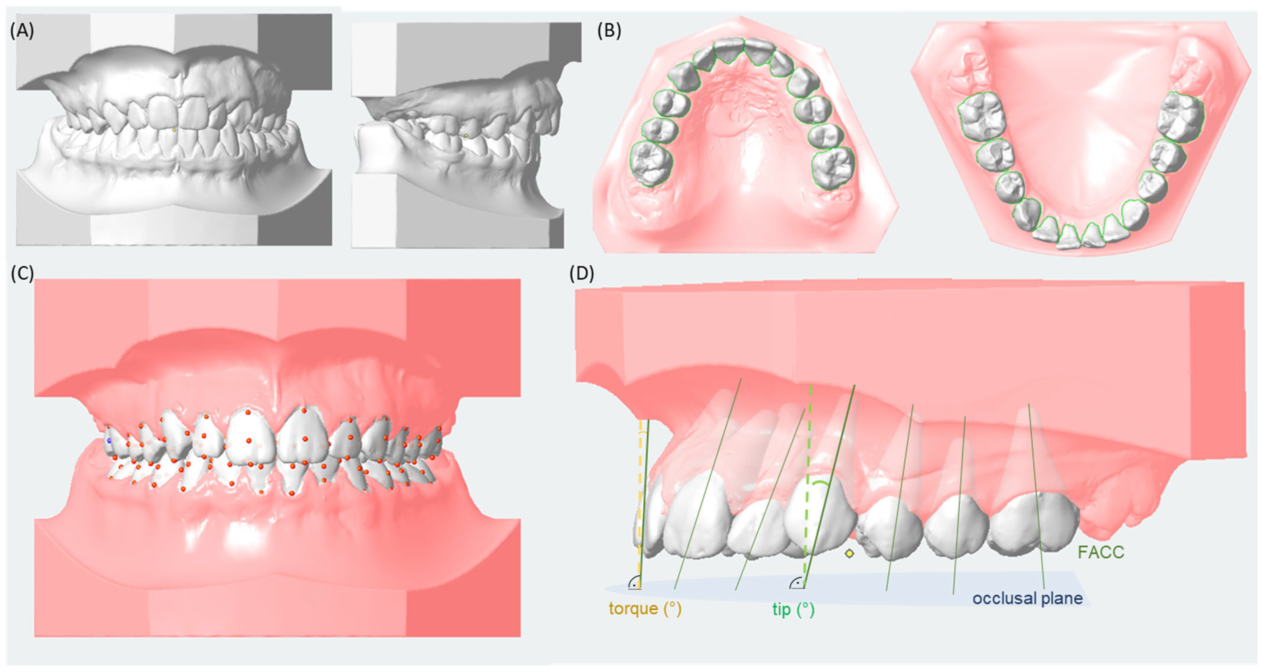 - Tong, H.; Kwon, D.; Shi, J.; Sakai, N.; Enciso, R.; Sameshima, G.T. Mesiodistal angulation and faciolingual inclination of each whole tooth in 3-dimensional space in patients with near-normal occlusion. Am. J. Orthod. Dentofac. Orthop. 2012, 141, 604–617. [Google Scholar] [CrossRef]