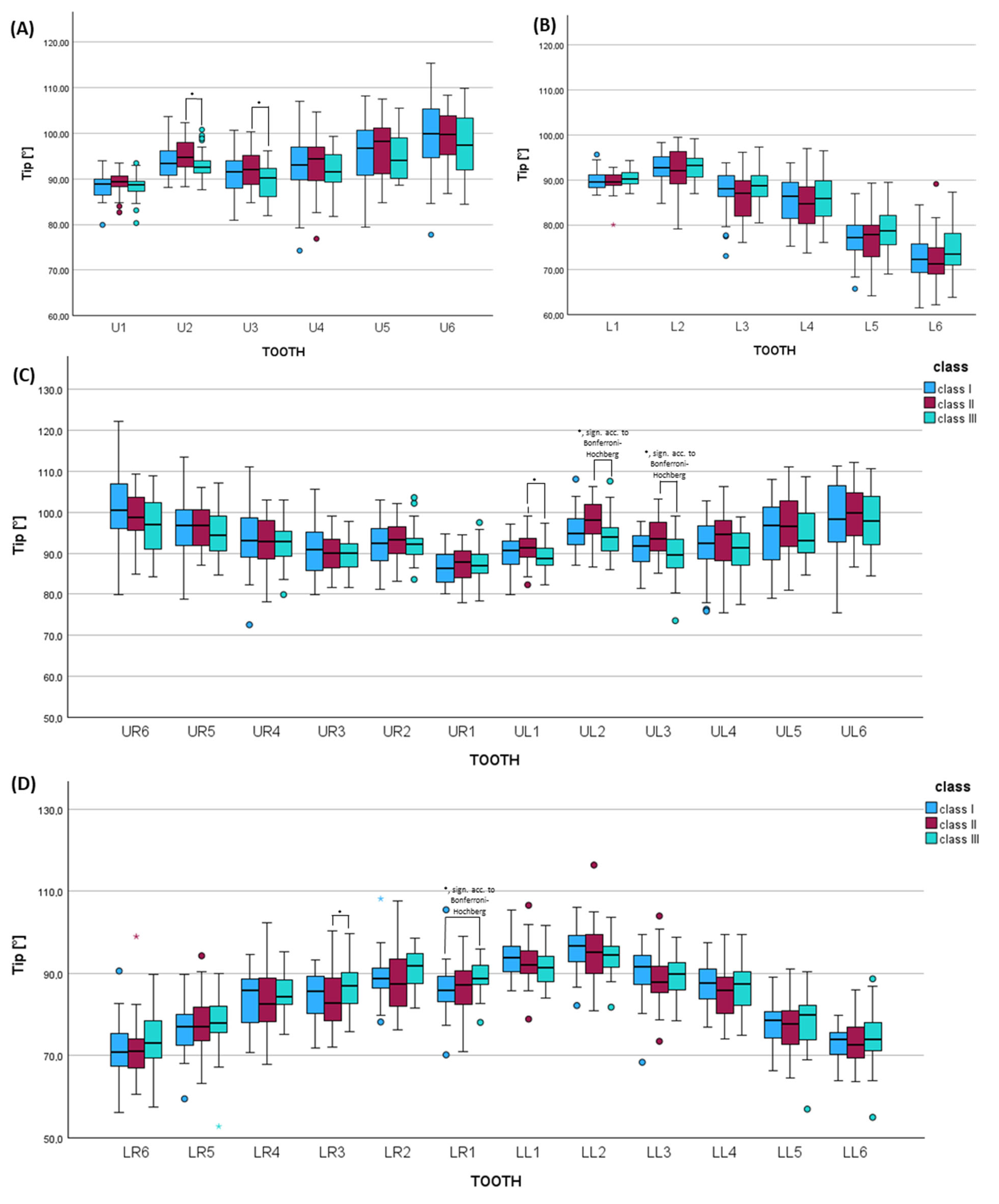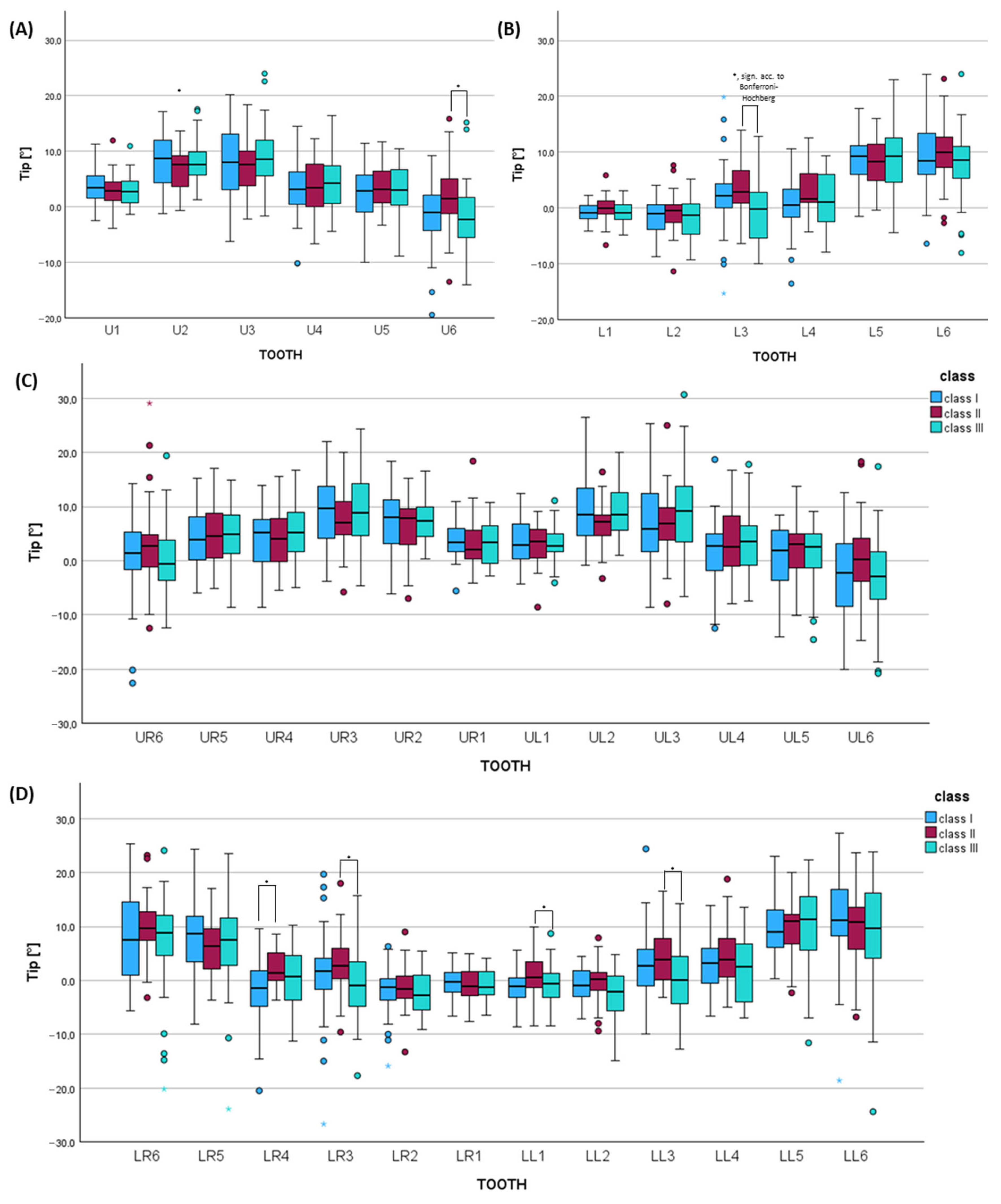 Chicago/Turabian StyleSeidel, Corinna L., Karolina Kelemenova, Uwe Baumert, Andrea Wichelhaus, and Hisham Sabbagh. 2025. "A Retrospective, Digital Evaluation of Tip and Torque of Teeth in Patients with Skeletal Class I, II and III Using Lateral Cephalograms, Orthopantomograms and Digitized Models" Journal of Clinical Medicine 14, no. 21: 7738. https://doi.org/10.3390/jcm14217738