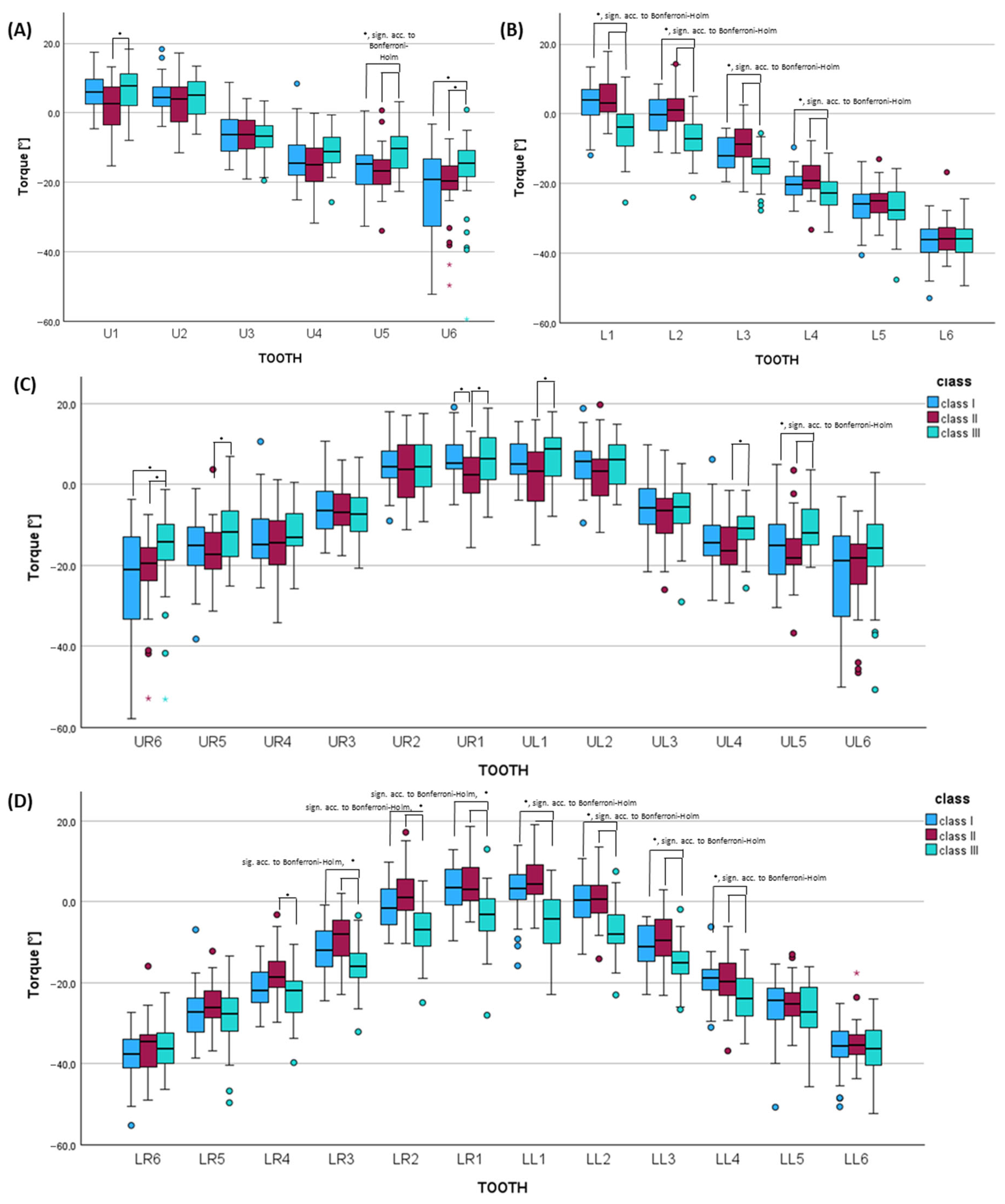 3.5. Digital Dental Cast Analysis Considering Torque of the Clinical Crown for Each Skeletal Class