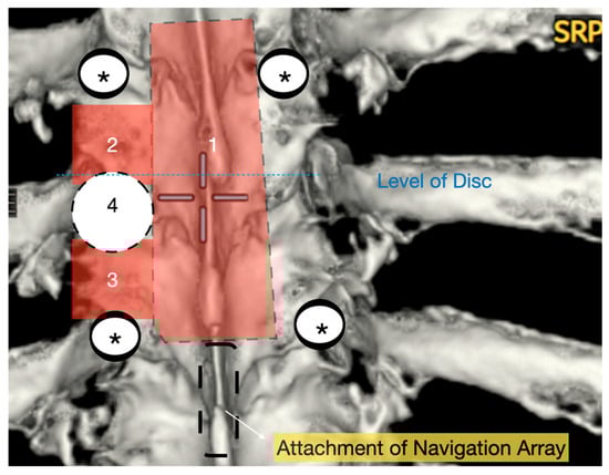 Three-dimensional reconstruction of area of interest (T9–11) with representation of osteotomies carried out with bone scalpel. 1: En block laminectomy; 2: ipsilateral upper facetectomy; 3: ipsilateral lower facetectomy; 4: ipsilateral pediculectomy. *: screws.