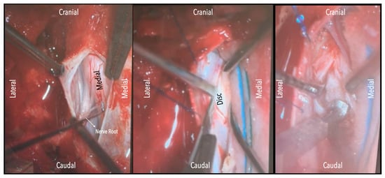 Intraoperative microscope view. Left-sided disc. Left: After opening the dura mater, the nerve root and cord are evident. Middle: Following drainage of CSF, dissection of the dentate ligament and gravity retraction, a micro-pattie is applied on the lateral aspect of the cord and a penfield microdissector is used to gently retract the cord, and the disc becomes evident. Right: Discectomy is carried out with a hockey stick bone scalpel.