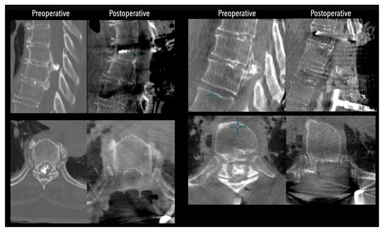 Comparative pre- and postoperative CT scans for two different patients (left and right), illustrating complete discectomy.