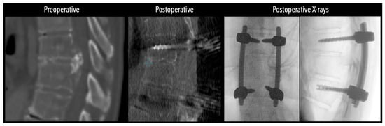 Left side: Comparative pre- and postoperative CT scan of a patient, illustrating complete discectomy. Right side: Postoperative X-rays illustrating fixation.