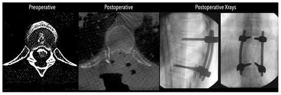 - Carr, D.A.; Volkov, A.A.; Rhoiney, D.L.; Setty, P.; Barrett, R.J.; Claybrooks, R.; Bono, P.L.; Tong, D.; Soo, T.M. Management of Thoracic Disc Herniations via Posterior Unilateral Modified Transfacet Pedicle-Sparing Decompression with Segmental Instrumentation and Interbody Fusion. Glob. Spine J. 2017, 7, 506–513. [Google Scholar] [CrossRef]