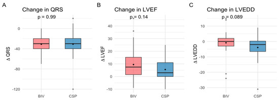Changes in QRS duration (A), left ventricular ejection fraction (LVEF) (B), and left ventricular end-diastolic diameter (LVEDD) (C) after upgrade to biventricular pacing (BIV) or conduction system pacing (CSP).