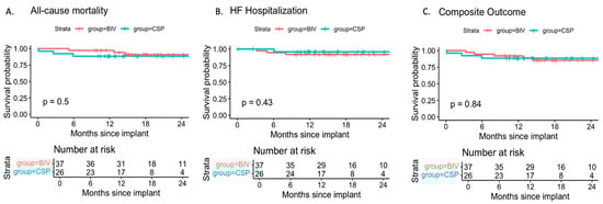 Freedom from (A) All-cause mortality, (B) heart failure (HF) hospitalization, and (C) the composite of death or HF hospitalization in patients with CSP or BIV upgrade. Survival probabilities are plotted over a 24-month period since device upgrade. Risk tables below each panel indicate the number of patients at risk at 6-month intervals. Differences between groups were compared using the log-rank test. No statistically significant differences were observed.