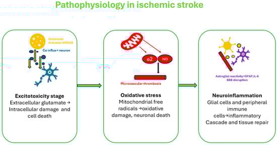 During an acute ischemic stroke (AIS), three major interconnected pathophysiological processes are initiated, as illustrated in Figure 1—excitotoxicity, oxidative stress, and neuroinflammation—each contributing significantly to neuronal injury and functional impairment [12].