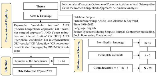 Figure 1 presents the PRISMA 2020 flow diagram outlining the selection and screening process of the publications. The thematic scope encompassed studies addressing open reduction and internal fixation (ORIF) of posterior acetabular wall fractures using the Kocher–Langenbeck approach, with particular emphasis on functional, neuromuscular, and vascular outcomes. The literature search was conducted in the Scopus database, covering the period from 1999 to 2025, and employed keywords reflecting the anatomical target, surgical technique, and physiological parameters of recovery.