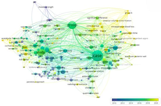 The results of the visual analysis indicate that the primary focus of the scientific community is concentrated on clinical effectiveness, the structure of complications, and the precision of surgical reduction in the treatment of acetabular fractures using the Kocher–Langenbeck posterior approach. In contrast, clusters related to neuromuscular and vascular outcomes—such as nerve injury, blood flow, and muscle strength—remain fragmented and underdeveloped. This highlights an existing research gap and underscores the relevance of the present study’s focus on these specific aspects.