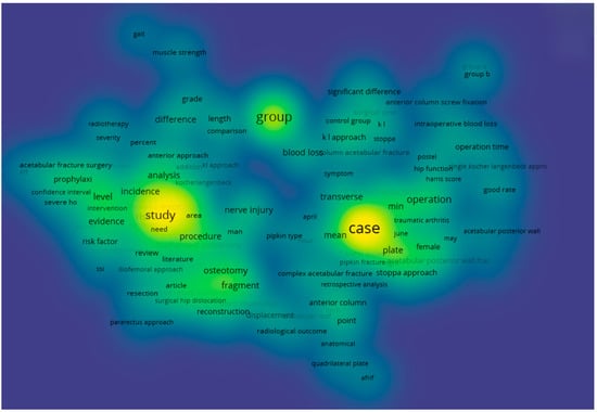 The densest areas of the map are concentrated around the terms case, group, study, operation, plate, blood loss, and significant difference, which once again confirms the dominance of topics related to clinical outcomes, study design, and statistical interpretation. In contrast, terms pertaining to neurophysiological and vascular aspects—such as muscle strength, gait, nerve injury, and radiological outcome—are located in low-density zones, suggesting a possible underappreciation of these areas in the current scientific agenda.