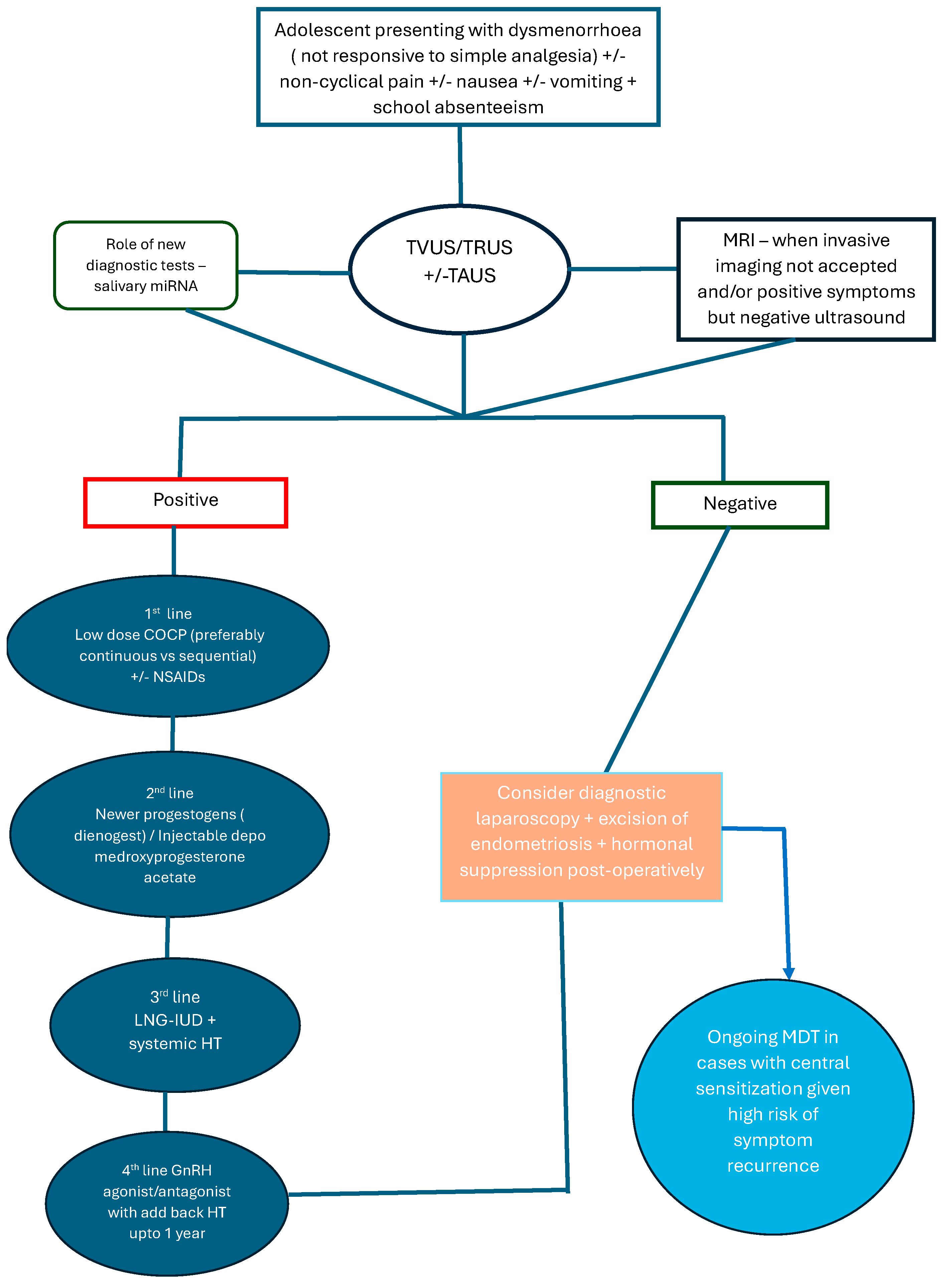 - Shim, J.Y. Dysmenorrhea and Endometriosis in Adolescents. Obstet. Gynecol. Clin. North. Am. 2024, 51, 651–661. [Google Scholar] [CrossRef]