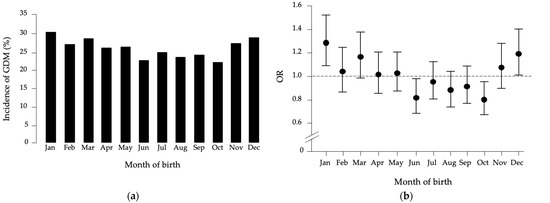 (a) Month-of-birth distribution of GDM in the studied population. (b) Odds ratio (OR) distribution with 95% confidence intervals for GDM patients versus healthy women, based on month of birth compared to all other months.