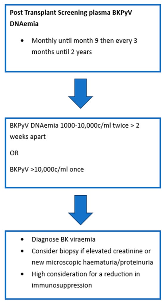 As BKPyV infection or reactivation post-transplant is largely asymptomatic, most programs have adopted screening protocols. Figure 1 demonstrates the most recent International Consensus Guidelines on the Management of BK Polyoma Virus in Kidney Transplant recommendations for screening [32]. In patients with sustained levels > 1000 c/mL, monitoring of BKVyP DNAemia is recommended every 2–4 weeks to monitor for response to intervention. Should patients require increased levels of immunosuppression then they should have monthly monitoring of BK viral levels for 3 months. BKPyV DNAemia is considered to be two to three consecutive measurements > 1000 c/mL or one single measurement > 10,000 c/ml [32,46]. A recent Cochrane review of urinary BKPyV QNAT compared its efficacy to that of serum and demonstrated that there was insufficient evidence to suggest the use of urinary testing as a primary screening tool. Serum testing with a cut-off of 10,000 copies/mL was robust with a sensitivity of 0.86 and specificity of 0.95. Of note, it was suggested that a lower cut-off closer to 2000 copies/mL may be more optimal as it would increase sensitivity to 0.89. However, it was acknowledged that the current cut-off of 10,000 copies/mL did offer good performance characteristics and supported the current recommendations [47].