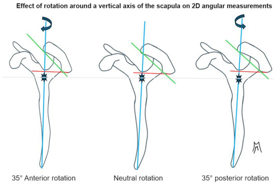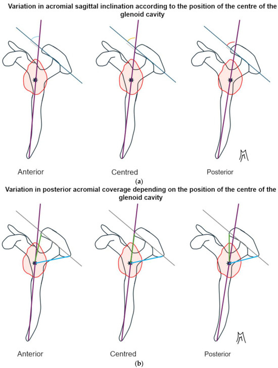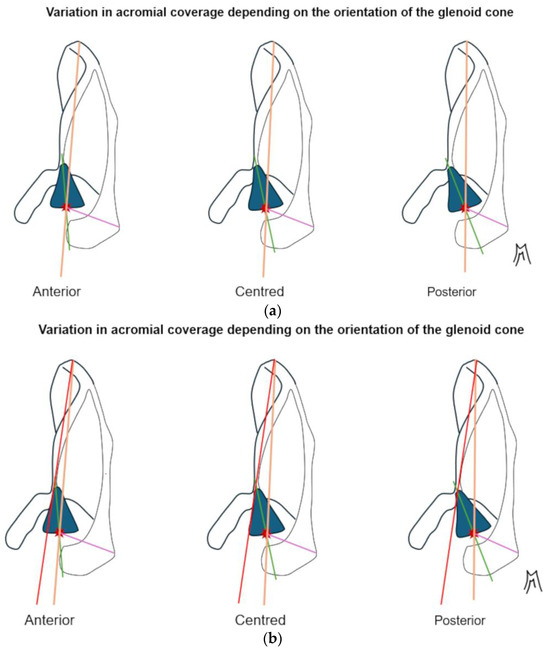 A second major source of heterogeneity lies in the choice of reference landmarks. Many studies define tilt and coverage relative to the glenoid center or axis [8,11]; Verhaegen et al. [12]; Livesey et al. [7], yet this reference may be pathologically altered. In eccentric osteoarthritis, the glenoid is often eroded and retroverted; in posterior instability, it is frequently decentered. As schematically shown in Figure 2, translations of the glenoid center artificially affect sagittal tilt, posterior coverage and height, while Figure 3 illustrates how changes in glenoid version rotate the reference axis itself, modifying tilt values even if the acromion has not changed. These factors explain why studies using different reference definitions often produce contradictory results.