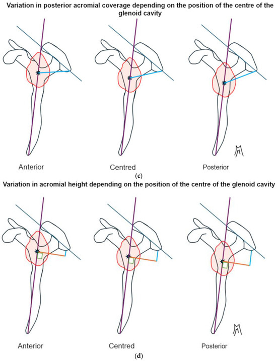 Schematic representation of a lateral view of the left scapula. The coracoid process is located on the left, and the acromion is on the right and above. The glenoid cavity is represented by the red circle. The center of the glenoid cavity is represented by the black asterisk. (a) The more posterior the position of the center of the glenoid cavity, which serves as a reference point for the vertical axis, the more open the sagittal tilt angle is. Consequently, a more posterior center of the glenoid cavity gives the impression that the acromion is more horizontal. (b) The more posterior the position of the center of the glenoid cavity, which serves as a reference point for the vertical axis, the more the posterior coverage angle decreases and the anterior coverage angle increases. Consequently, the anteroposterior position of the center of the glenoid cavity influences the coverage by the acromion. (c) The higher the position of the center of the glenoid cavity, which serves as a reference point for the vertical axis, the greater the posterior coverage angle and the greater the total coverage. Consequently, the height of the position of the center of the glenoid cavity influences the coverage by the acromion. (d) The higher the position of the center of the glenoid cavity, which serves as a reference point for the vertical axis, the lower the acromial height. Consequently, the height of the position of the center of the glenoid cavity influences the perception of the height of the acromion.