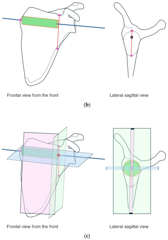 Schematic representation of the development of a three-dimensional measurement model of the scapula. Left scapula seen from the front in the image on the left and from the side in the image on the right. (a) A cylinder is depicted at the junction of the upper and lower bodies of the scapula and the scapular spine with a central axis. This axis is part of the axial plane. (b) Establishment of reference points on the frontal plane: one medial point corresponding to the most medial bone point on the axis. Two lateral points, at the apexes of the convexity of the middle of the scapular notch and the lateral lower edge, with the line connecting the two points passing through the axis of the cylinder and being parallel to the surface of the cylinder. (c) The pink plane is the frontal plane defined by the three points described above. The green plane lies in a plane parallel to the surface of the cylinder and constitutes the sagittal plane. The two planes are orthogonal. The blue plane is the axial plane, which is orthogonal to the previous two. The center of the coordinate system is the point where the three planes meet on the central axis (red star).