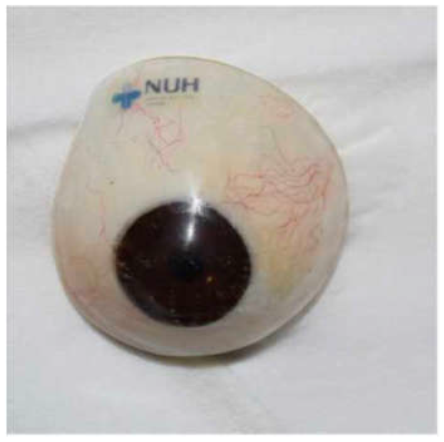 - Avisar, I.; Norris, J.H.; Quinn, S.; Allan, D.; McCalla, M.; Dugdale, D.; Parulekar, M.; Malhotra, R. Temporary cosmetic painted prostheses in anophthalmic surgery: An alternative to early postoperative clear conformers. Eye 2011, 25, 1418–1422. [Google Scholar] [CrossRef] [PubMed]