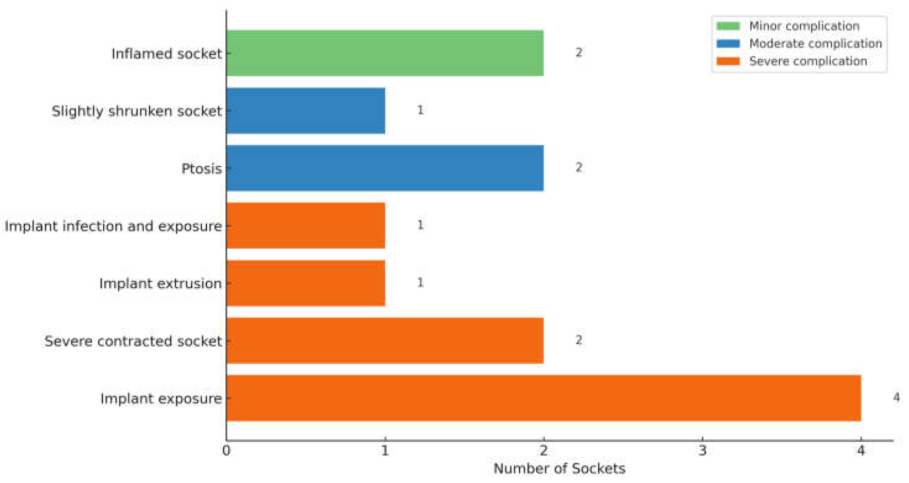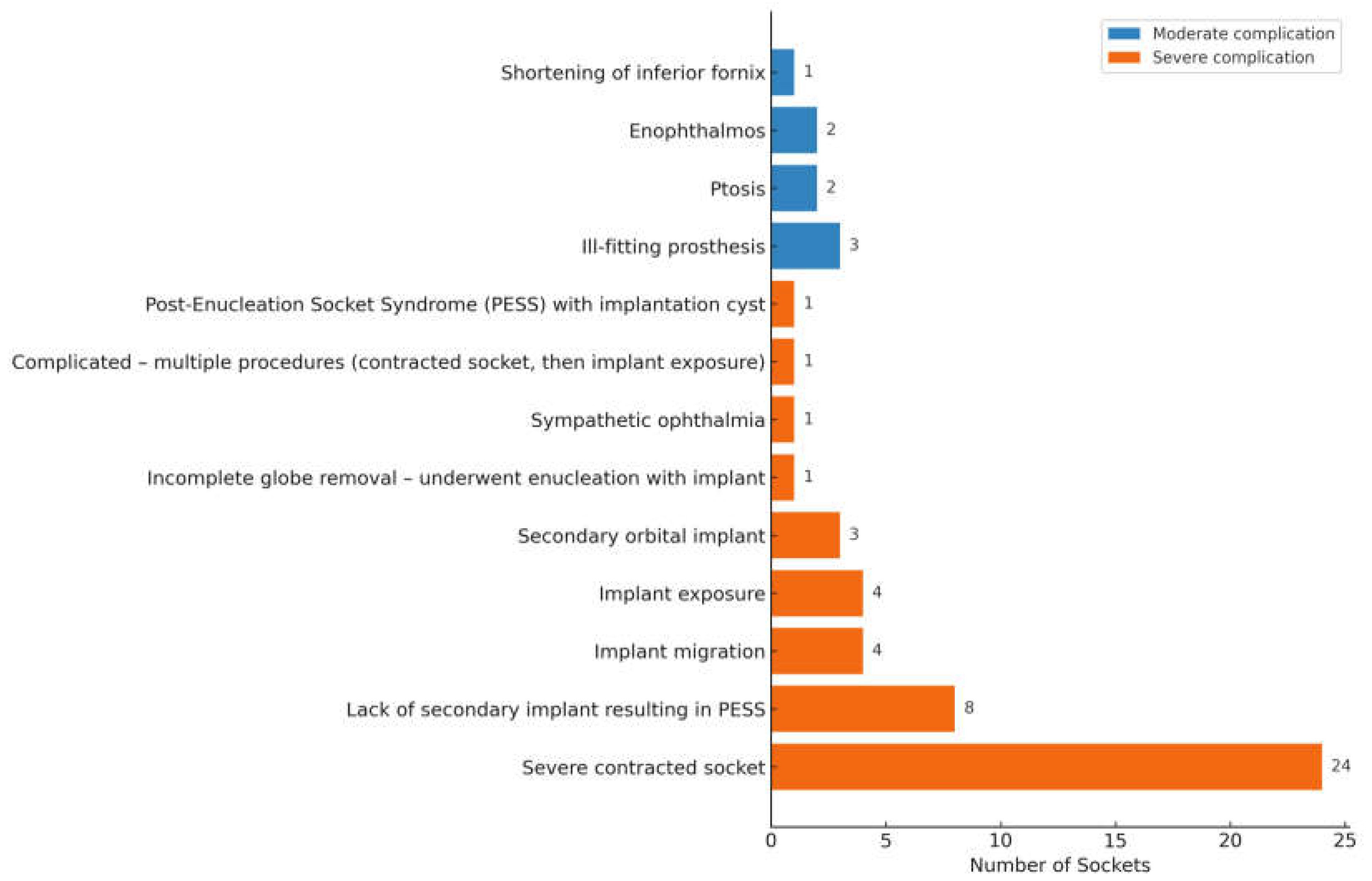 | Severe | Incomplete globe removal, implant extrusion, exposure, severe contracted sockets, severe infections, revision surgery, etc. |
