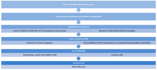 The ESMO strategy proposed in 2020 recommends withdrawing NSIM and introducing an induction period with SIM prior to initiating ICI therapy [3]. Although this may not always be feasible, joint follow-up by oncologists and the specialists managing SAID should be established from the first patient contact and continue before, during, and after ICI therapy [3]. Multidisciplinary follow-up should be particularly strict during the first three to six months after ICI initiation, as complications are more frequent in this period [15,16,33].