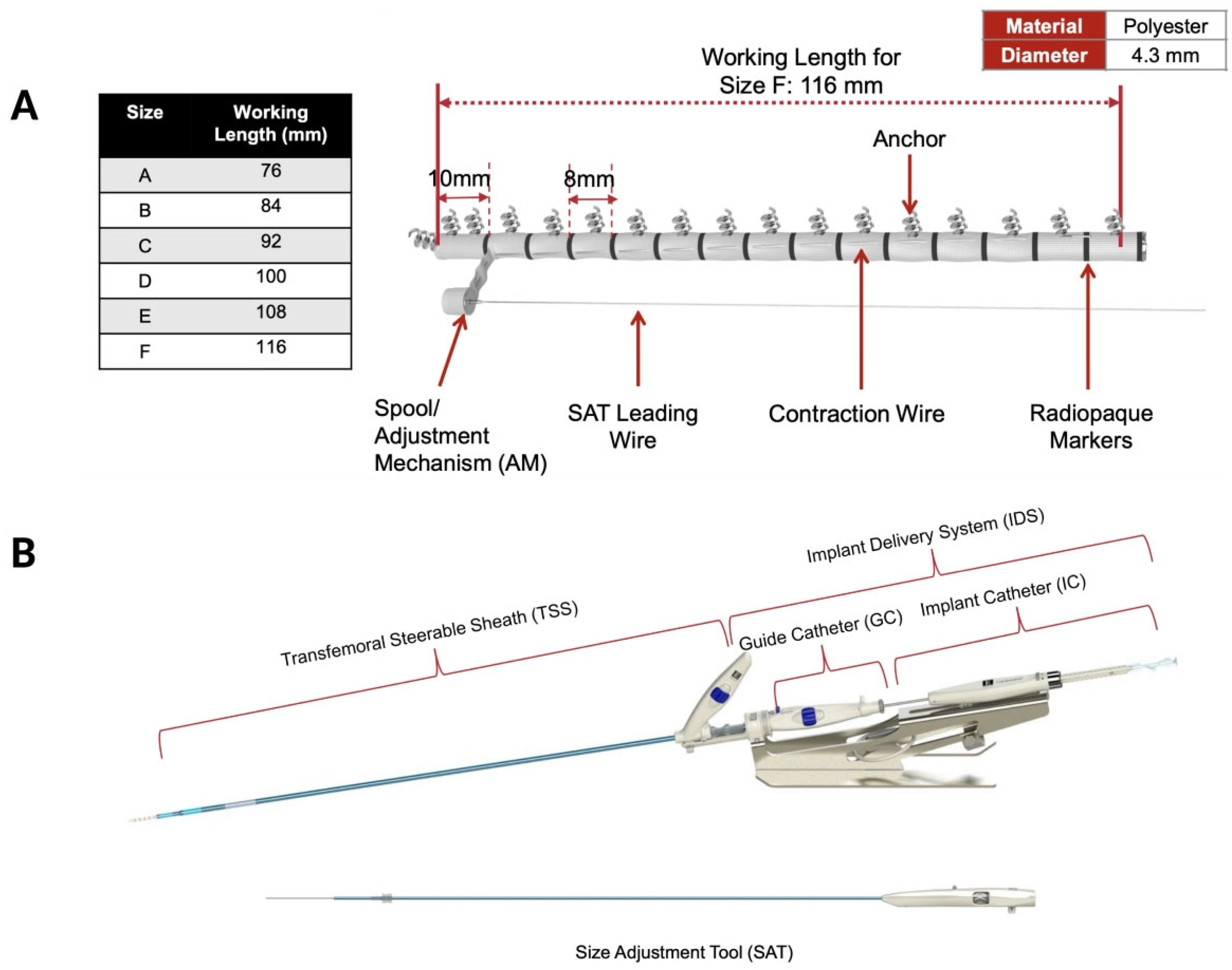 Figure 1B). The implant delivery system comprises a steerable guiding catheter and an implant catheter (IC) with the implant device mounted at its distal tip. Finally, the size adjustment tool (SAT) connects to the implant wire spool and controls band contraction, allowing up to a 30% reduction in the annular perimeter during cinching.
