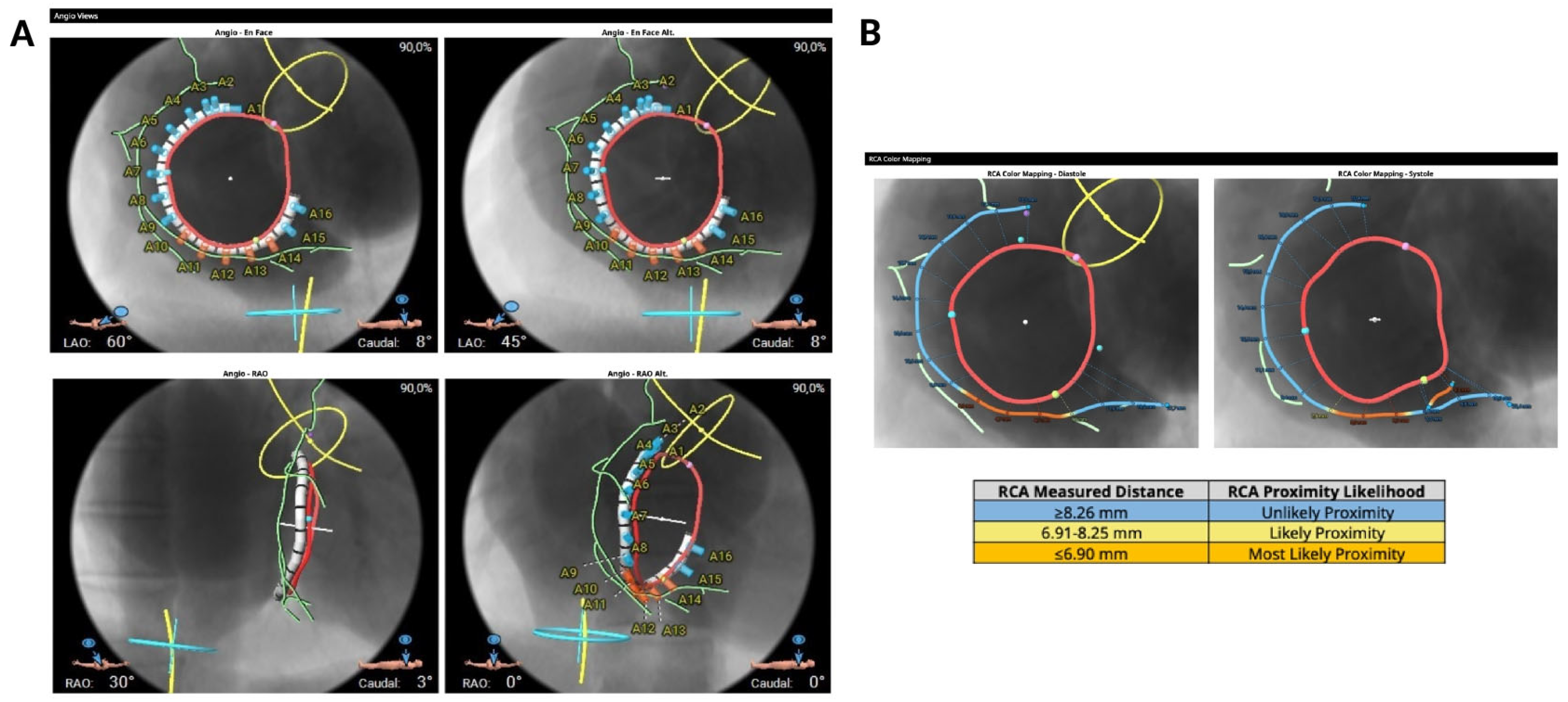 Figure 3A). Anatomical suitability for transcatheter annuloplasty includes an ideal safety margin between the annulus and the RCA of 6.9 mm (with a minimal required distance of 2.6 mm, equivalent to the anchor diameter) (