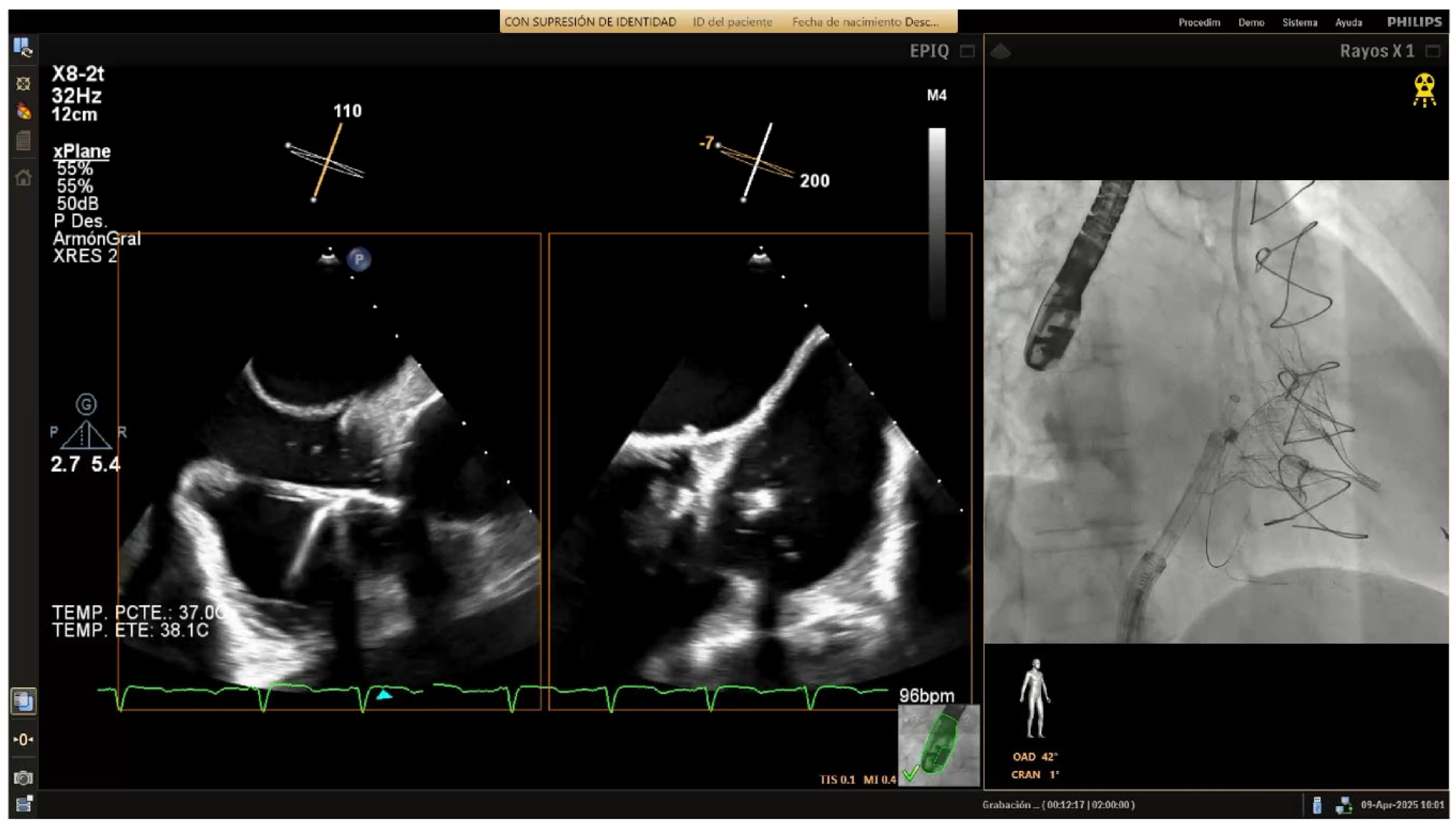 The procedure is conducted under general anesthesia and TEE guidance, through right venous femoral access (26F). In addition, an arterial access (6F) is needed to cannulate the RCA and advance a radiopaque guidewire for fluoroscopic reference.