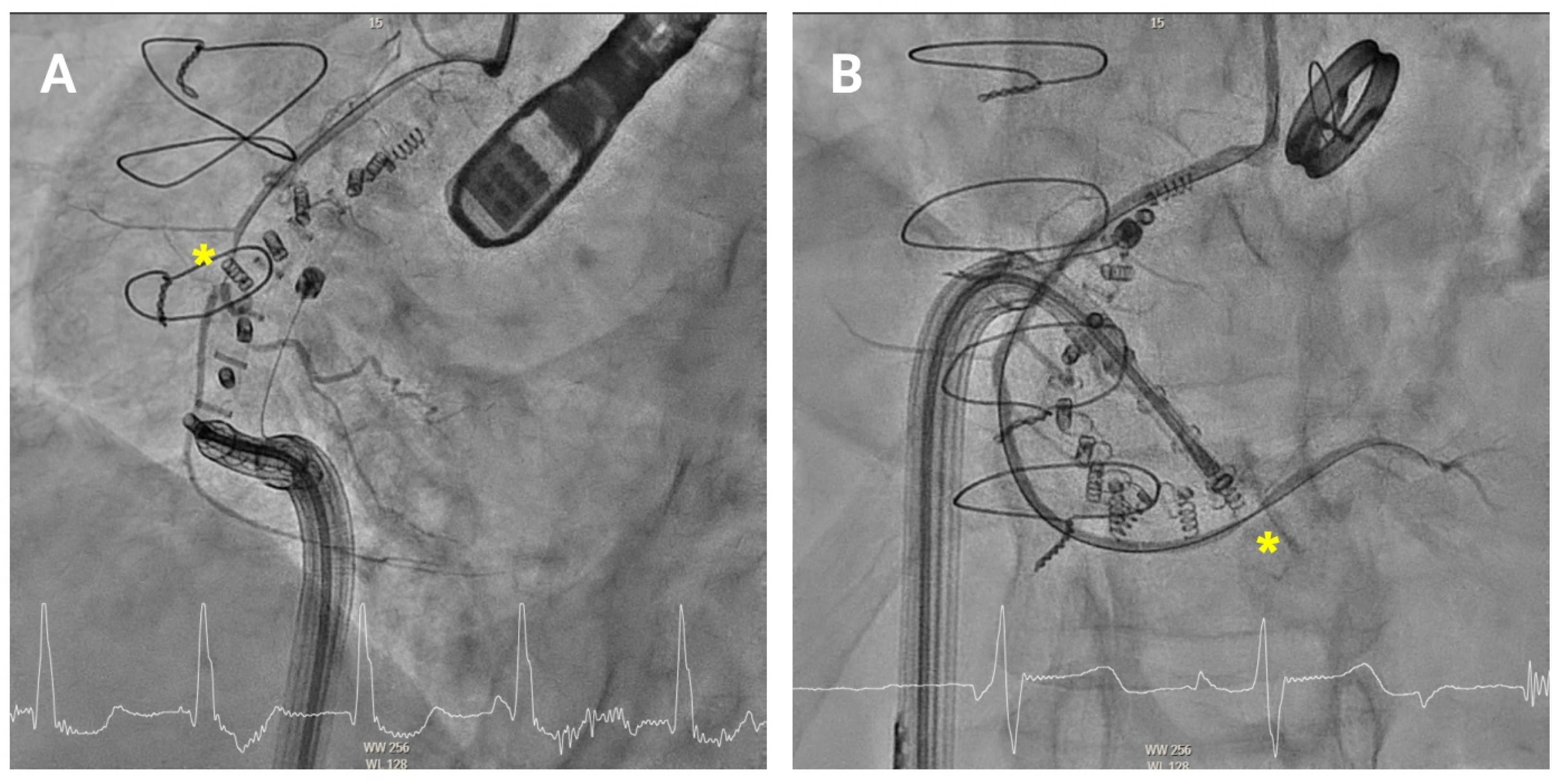 Pinching of the right coronary artery. Coronary angiography showing anchor-related pinching (asterisk) of the mid (A) and distal (B) right coronary artery.