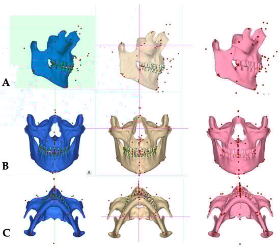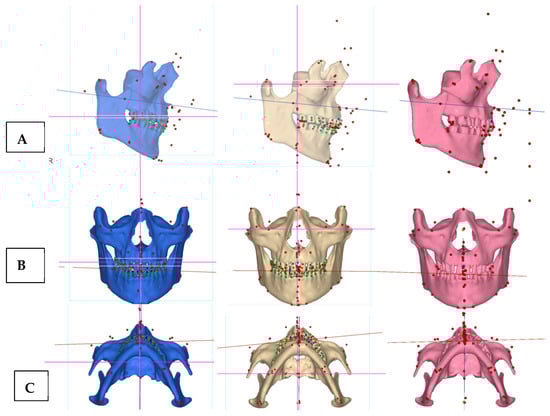 Pre-treatment (blue), post-expansion (beige), and post-aligner (pink) CBCT volume orientation in three spatial planes. (A)—Orientation in the sagittal plane with the Orbito-Condylion plane as a reference; (B)—coronal plane orientation with the Orbital plane as a reference; and (C)—axial plane orientation with the ANS-PNA plane as a reference.