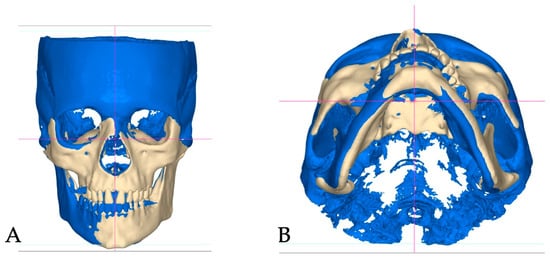 Pre-treatment (blue) and post-expansion (beige) renderings superimposed and shown in coronal (A) and axial–caudal (B) projections. The axial–caudal view clearly shows asymmetrical displacement of the left maxillary dentoalveolar process, along with the left palatal process of the maxillary bone, due to asymmetrical disarticulation of the transverse suture.