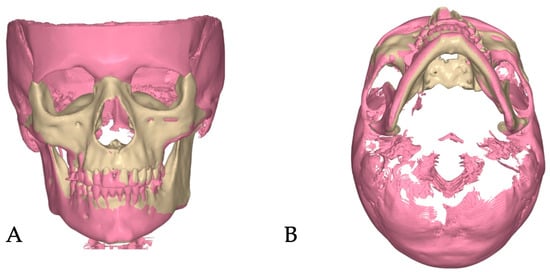 Post-expansion rendering (beige) superimposed over post-aligner (pink) rendering and shown in two projections ((A)—coronal, (B)—axial–caudal) showing greater impact of the directly printed aligner treatment on compensation of the left palatal process drift due to asymmetric disarticulation of the transverse suture.