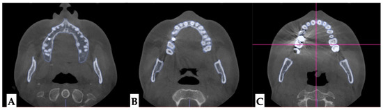 The sagittal view of the axial cross-section of maxillary incisors after aligner axis correction: (A)—maxillary right lateral incisor; (B)—maxillary right central incisor; (C)—maxillary left central incisor; (D)—maxillary left lateral incisor. The axial inclinations of all maxillary incisors have improved, with significant reductions in buccal root torque in the maxillary left central and lateral incisors with directly printed aligner orthodontic movement (Table 3).