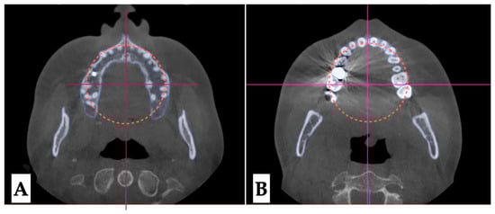 Pre-treatment axial plane visualizations. (A)—Axial slice at the level of the ANS, with the skull oriented to all three reference planes; this view shows closer proximity of the left upper quadrant roots to the buccal cortical plate of the alveolar process. (B)—ANS-PNS and Orbital plane orientation at the level of the lower 1/3 of the root length. Both views show asymmetry in UL root positioning relative to the constructed circle, with vertical diameter coinciding with the ANS-PNS plane. The vertical line represents midfacial plane in axial projection with the horizontal line being the line perpendicular to the midfacial vertical constructed through the middle of the maxillary right first molar.