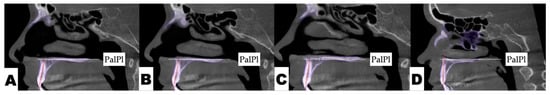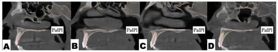 The sagittal view of the maxillary incisor axial cross-section. (A)—Maxillary right lateral incisor; (B)—maxillary right central incisor; (C)—maxillary left central incisor; (D)—maxillary left lateral incisor. The axial inclinations of the maxillary left incisors are steeper compared to those on the right side. PalPl- Palatal Plane, the line constructed through ANS and PNS.