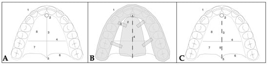3D guide planning stages for the midpalatal piezocorticotomy: (A)—orientation of the main structures of the hard palate (1—dental arch, 2—incisive foramen, 3—midpalatal suture, 4—transverse suture, 5—point PNS, 6—posterior border of the palatine bone, 7—transverse process of the palatine bone, 8—palatal process of the maxillary bone), (B)—schematic image of the constructed guide, (C)—location of the incision (9—piezocortical incision location following application of the 3D guide).