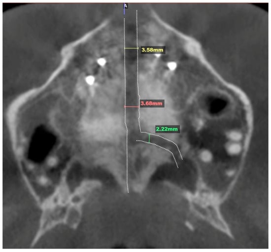 Piezocorticotomy cuts were individually planned for the patient to preserve approximately 10–12 mm of intact midpalatal suture anteriorly near the incisive foramen to prevent neuro-vascular damage. The cuts extended posteriorly toward the posterior nasal spine (PNS), enabling midsagittal separation of the maxillary palatal processes and the horizontal plates of the palatine bones. The design of the midpalatal 3D guide was described in an earlier publication [11] and accounts for root proximity, incisive foramen location, and, mainly, the orientation of the nasal septum attachment to the maxillary crests in the axial orientation, which does not necessarily follow the orientation of the mucosal outline of the midpalatal suture, leaving purely visual landmarks for performing midpalatal auxiliary disarticulation techniques. The choice of the 3D-guided midpalatal piezocorticotomy-assisted technique combined with MARPE was made to avoid the limitations of the midpalatal suture orientation, preserve nasal septum position, and ensure symmetrical and even disarticulation, as well as to allow for minimal side effects related to peri-maxillary suture-contributing resistance decreasing the potential of the MARPE appliance capacity (Figure 11).