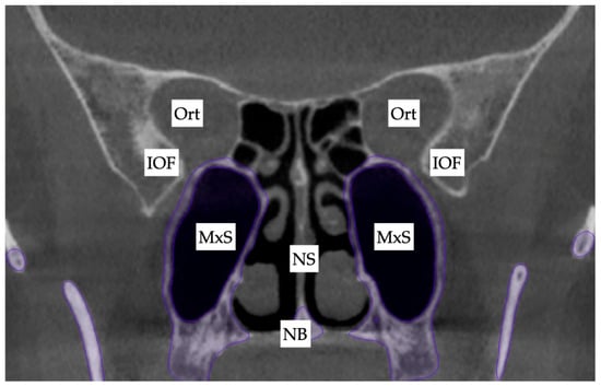 The initial inclination (yaw) of the maxillary base at the level of the maxillary sinus posterior wall and the inferior orbital fissure. Ort—Orbit; IOF—inferior orbital fissure; MxS—maxillary sinus; NS—nasal septum; NB—nasal base.