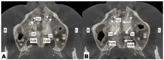 Disarticulation of the midpalatal and transverse sutures with 3D-guided midpalatal piezocorticotomy-assisted MARPE. Both axial slices show disarticulation of the transverse suture, with a greater degree of separation on the left side. Arrows point to areas of disarticulation. R—right side; L—left side; MpS—midpalatal suture; TrS—transverse suture; PalB—palatine bone. (A)—caudal axial slice (showing no right-side transverse suture disarticulation and 1.5 mm of left-side disarticulation); (B)—rostral axial slice (showing 1 mm of right-side disarticulation and 2.22 mm of left-side transverse suture disarticulation).