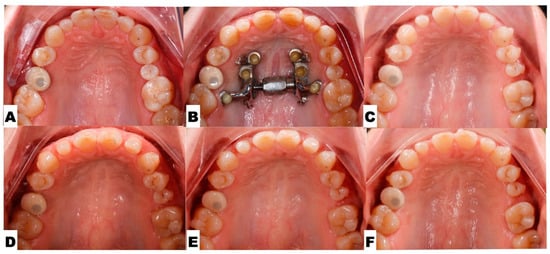 The progression of post-expansion aligner dentoalveolar movements, with redistribution of teeth along the dentoalveolar process for further restorative treatment of microdontia. (A)—Pre-expansion; (B)—immediately after completion of 3D-guided midpalatal piezocorticotomy-assisted MARPE; (C)—distalization of the left posterior teeth initiated with space opening for restorative treatment of lateral incisors and second maxillary left premolar; (D–F)—progression of direct aligner-assisted tooth movements for premolar de-rotation, molar distalization, and axial inclination correction for maxillary incisors, with alignment of incisal edges due to complex root torque movements.