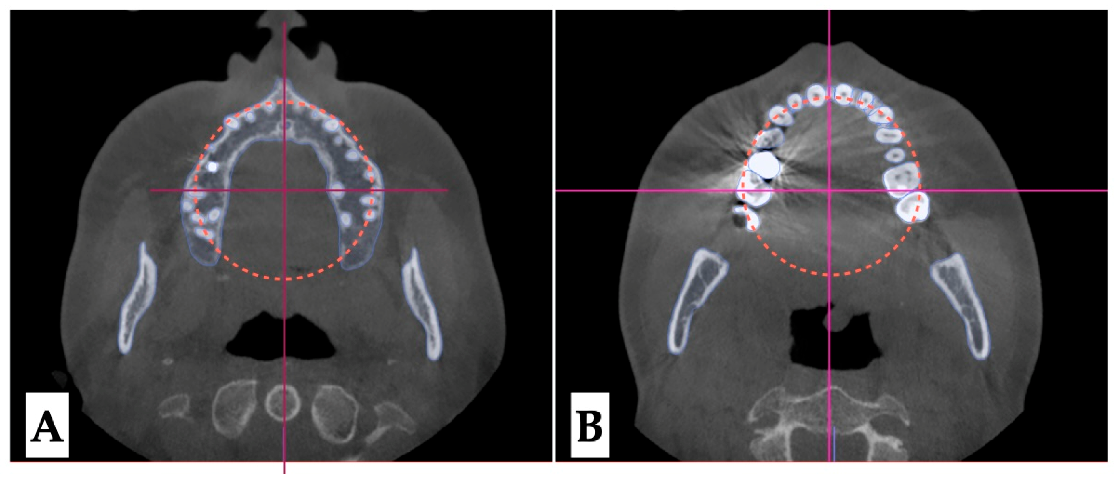 - Barton, B.; Jamieson, S.; Del Santo, M.; Vich, M.L.; Liu, D.; Yadav, S.; Mehta, S.Y. Long-term assessment of skeletal and dental asymmetry after conventional and mini-implant-assisted rapid palatal expansion. Am. J. Orthod. Dentofac. Orthop. 2025, 167, 399–408.e1. [Google Scholar] [CrossRef] [PubMed]