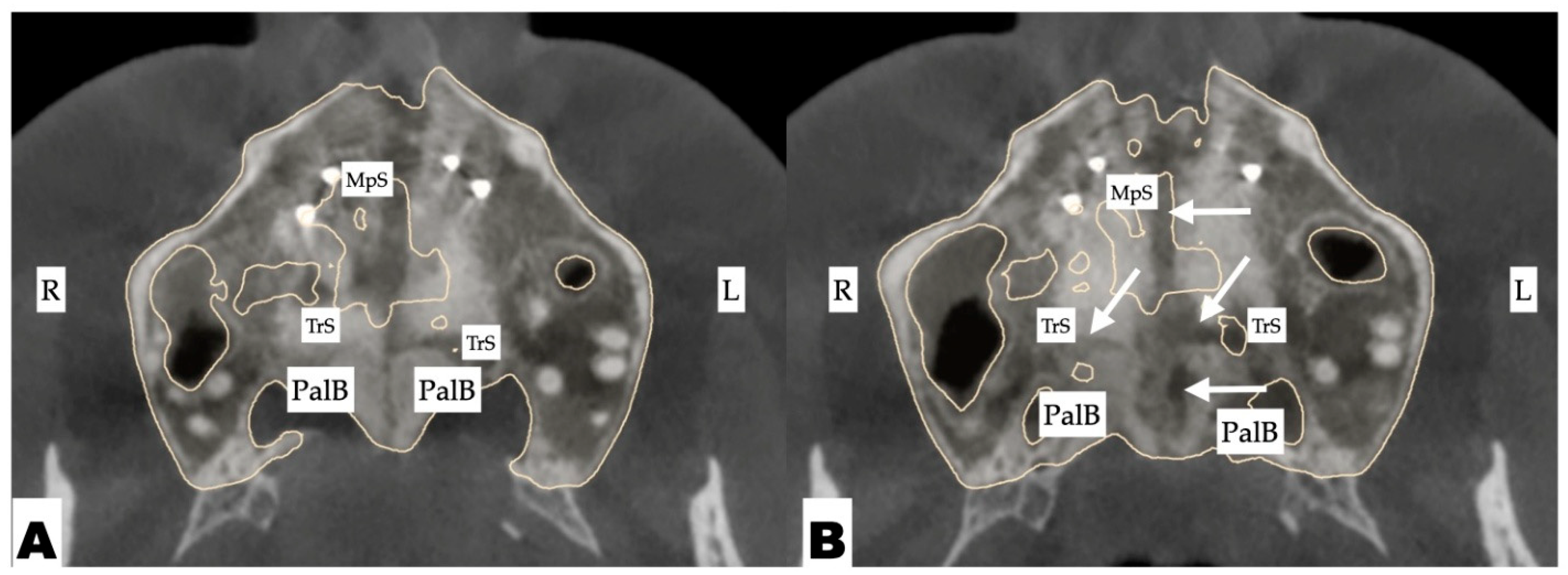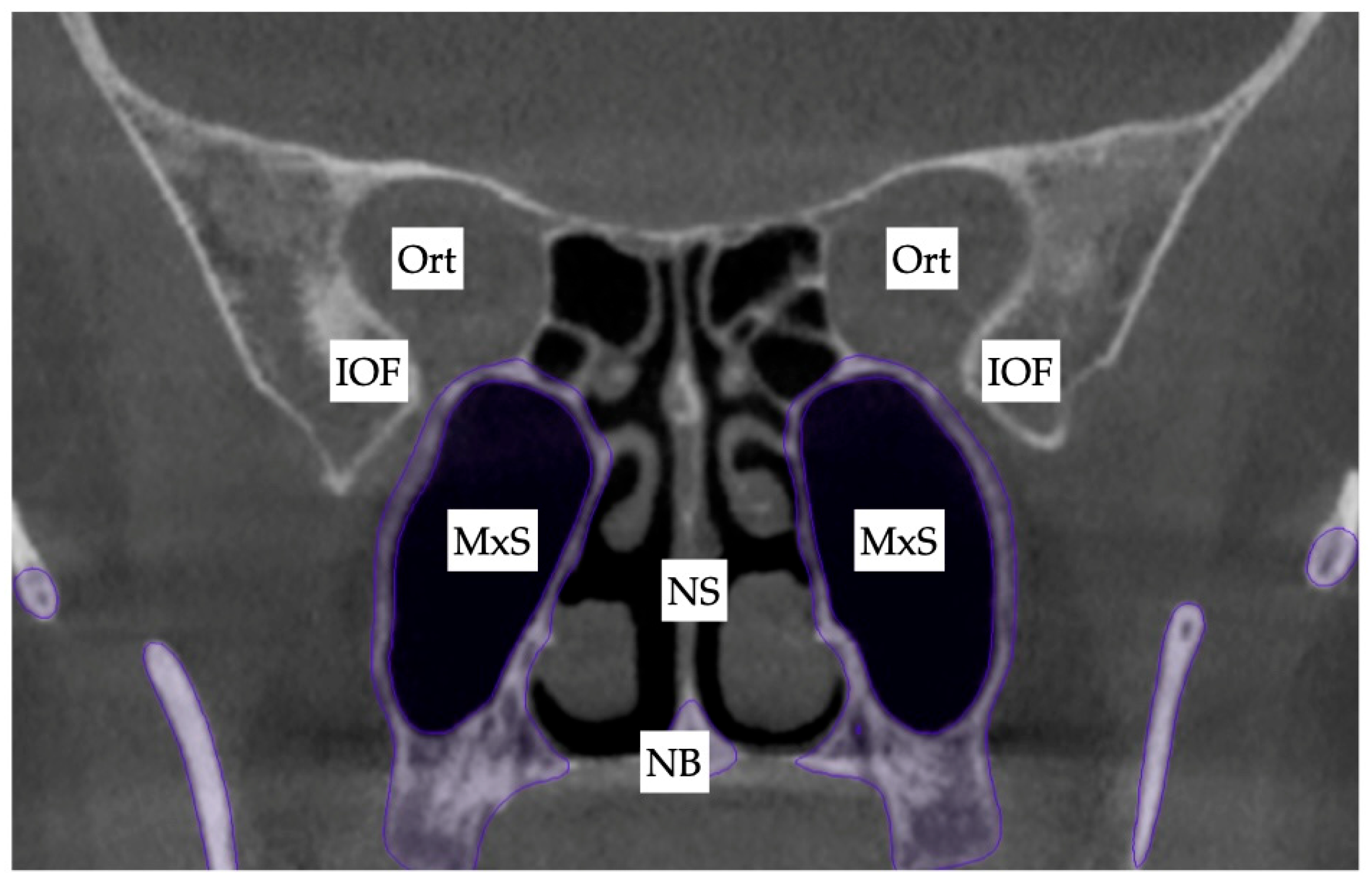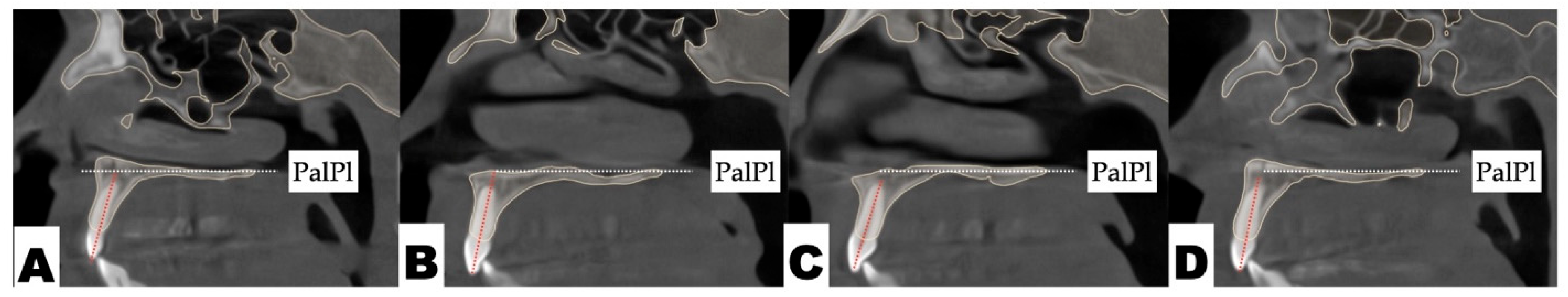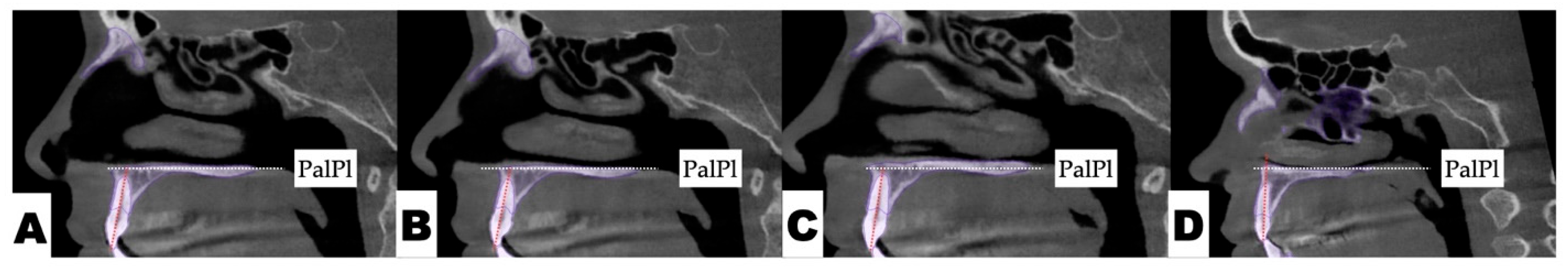 - Cantarella, D.; Dominguez-Mompell, R.; Moschik, C.; Sfogliano, L.; Elkenawy, I.; Pan, H.C.; Mallya, S.M.; Moon, W. Zygomaticomaxillary modifications in the horizontal plane induced by micro-implant-supported skeletal expander, analyzed with CBCT images. Prog. Orthod. 2018, 19, 41. [Google Scholar] [CrossRef]