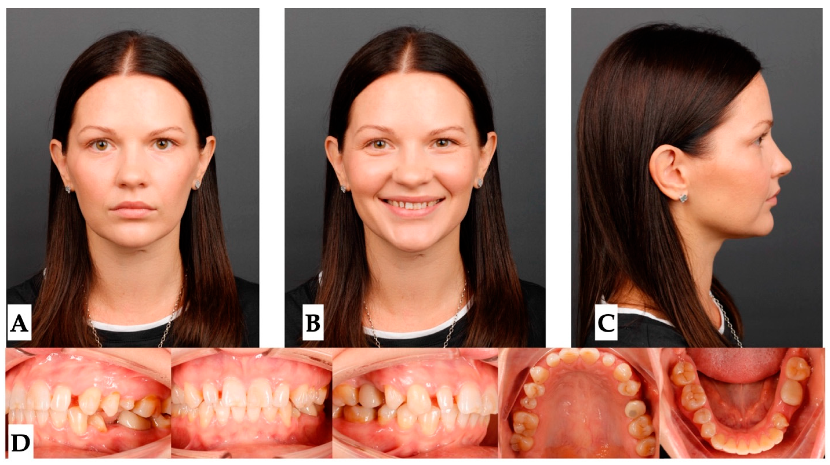 - Fan, Y.; Li, Y.; Fan, M.; Lin, Y.; Xu, J.; Li, Z.; Luo, J. Successful treatment for an adult with bilateral posterior teeth crossbite by miniscrew-assisted rapid palatal expansion: A case report. Clin. Case Rep. 2024, 12, e9216. [Google Scholar] [CrossRef]