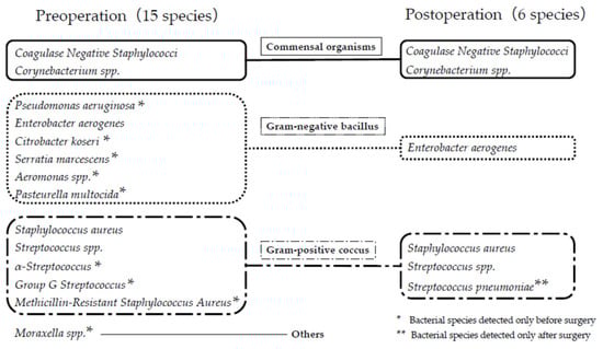The total number of bacterial species isolated decreased from 15 species preoperatively to six species postoperatively. In particular, Gram-negative bacilli markedly decreased from six species before surgery to one species after surgery. Among Gram-negative bacilli, only a single strain of Enterobacter aerogenes was detected in one case, and the other five species were not detected at all (Table 2) (Figure 2).